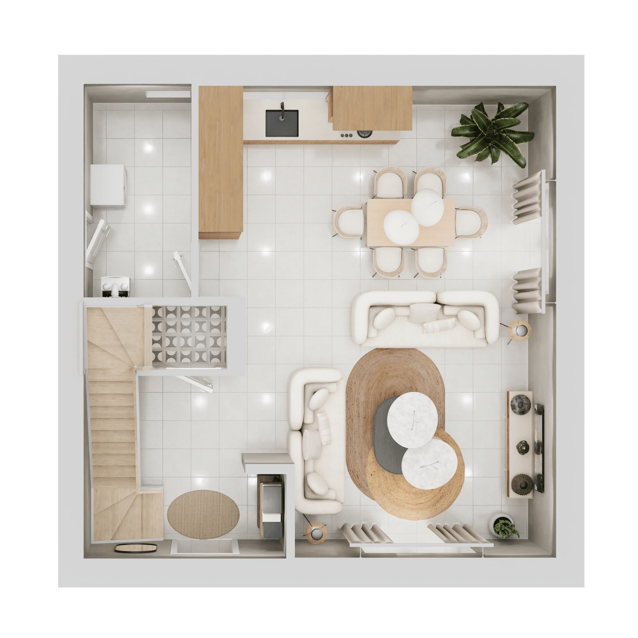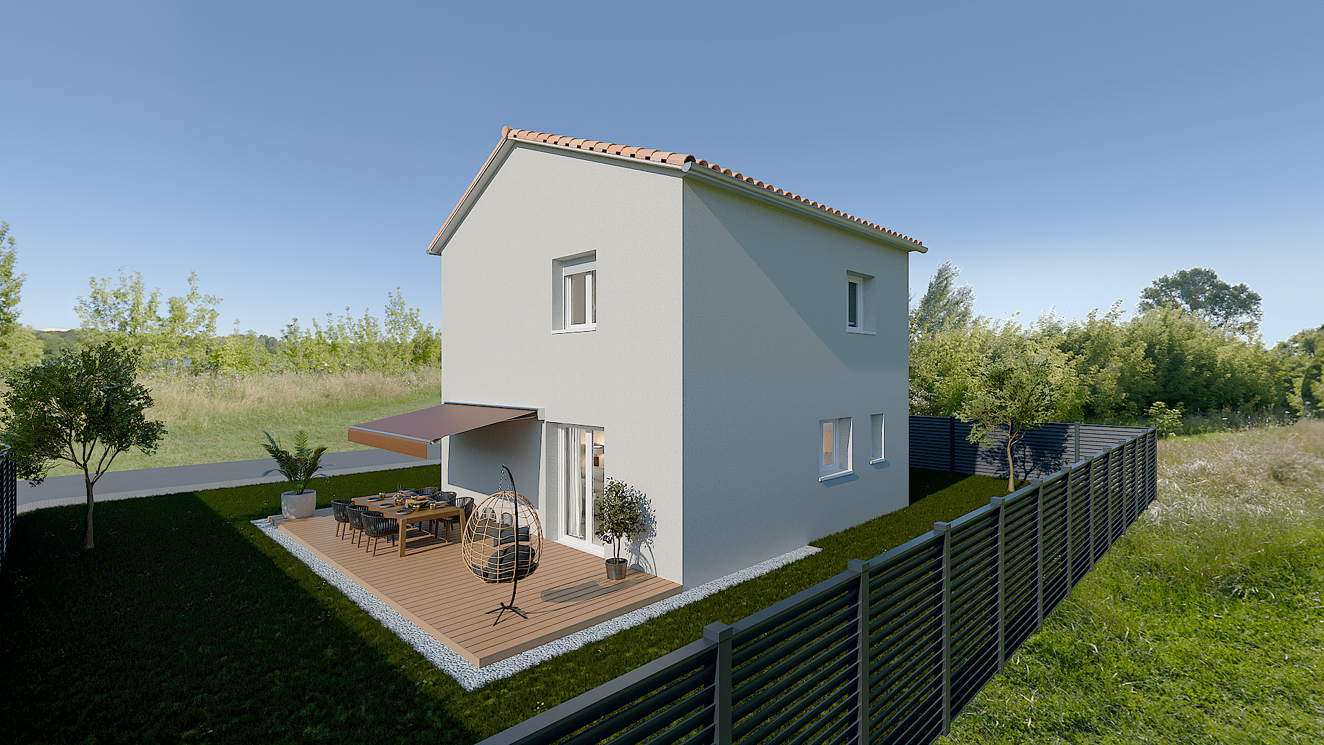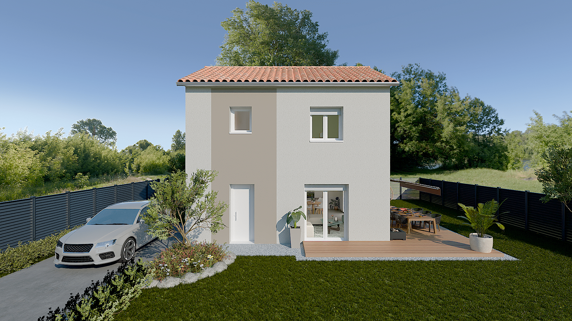 Maison Lorenza – 80m² à étage Modèle à étage de 80m² avec 3 chambres. Parfaite pour une famille, la maison Lorenza offre des prestations modernes avec un garage intégré et une gestion intelligente de l’énergie grâce à la domotique. Conforme aux normes RE 2020, elle combine design et économie d’énergie. Elle se compose de :