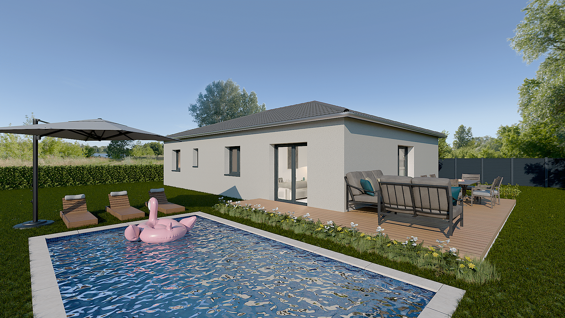 Maison Luigia – 90m² de plain-pied Spacieuse maison de plain-pied de 90m² avec 3 chambres, idéale pour un confort de vie optimal. Son pack domotique, ses finitions soignées et son garage intégré en font une maison moderne et économe en énergie, conçue selon les normes RE 2020.